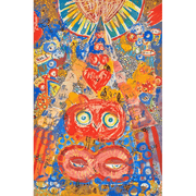 Inspired from the experience the artist had teaching identity and art to preteen girls, most of whom had just moved from the Dominican Republic, SJ Lapp has continued to add owls to this piece as the years have gone on.