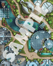 This line of gaming maps provides ready-to-use science fantasy set pieces for the busy Game Master. This double-sided map features an upscale, futuristic city center on one side and the dark and dangerous alleys of a dystopian megacity on the other, providing the perfect setting for any science fantasy urban escapade.