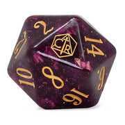 This beefy 36mm oversized d20 features a beautiful galaxy purple resin with copper numbers and the Critical Role logo on the 20 side of the d20. It comes packed snugly in a custom box.