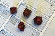 These handsome, high-quality dice, in black with red engraving, are specially marked for the Cypher System. They bear the Cypher System symbol on the highest-numbered face of each die, and the d20 includes special markings on the 17, 18, and 19 faces making it easy to identify those special effect results.