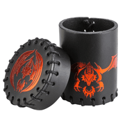 This black leather dice cup features a red, flying dragon and is perfect for your dice-rolling needs.