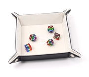 This reversible dice tray is leather on one side, velvet on the other. Or leave one side down and roll the dice towards the walls.