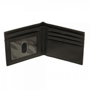 The wallet opens to reveal 3 horizontal card pockets, 2 vertical card pcokets, 1 full-size currency compartment, and a transparent ID window.