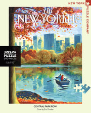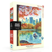 A couple enjoys a row in Central Park amongst the autumn leaves with the Manhattan skyline in the background.
