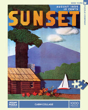 From a Sunset Magazine cover of the early 20th century, a collage of a cozy log cabin with a stone chimney and cheerful red flowers in front sits beneath a huge tree beside a lake with a sailboat gliding by.