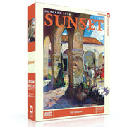 Bucolic painted image of a southwestern mission style courtyard. In view is a southwestern Spanish attired male with a wide brimmed hat alongside a burro.