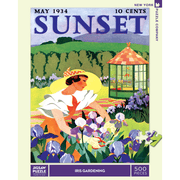 From the cover of Sunset Magazine in 1934, Evelyn Simonds paints a colorful scene of a lovely lady in a broad brimmed hat tending to her garden of irises, with an aviary and hills in the background.