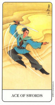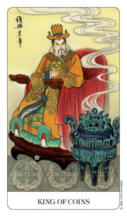 Elegant ink and watercolor designs skillfully blend archetypal symbols of Ancient Chinese literature, legend, philosophy, and culture. The Major Arcana draws upon the benevolent wisdom and insight of inspirational figures such as Confucius, Kuan Yin, and Chang Tao Ling, the Heavenly Master. The fully pictorial Minor Arcana are equally endowed with the lessons of Chinese history.